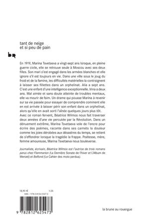 En 1919, Marina Tsvetaeva a vingt-sept ans lorsque, en pleine guerre civile, elle se retrouve seule à Moscou avec ses deux filles. Son mari s'est engagé dans les armées blanches et elle ignore s'il est toujours en vie. Dans une ville sous le joug du froid et de la famine, les difficultés matérielles la contraignent à laisser ses fillettes dans un orphelinat. Alia a sept ans. C'est une enfant d'une intelligence exceptionnelle. Irina a deux ans. Mal aimée et sans doute atteinte de troubles mentaux, elle va mourir de faim. Un drame qui pousse Marina à revenir sur sa vie passée pour essayer de comprendre comment elle en est arrivée à laisser périr son enfant dans un orphelinat, alors qu'elle en avait sorti l'aînée quelques jours plus tôt. Avec ce roman fervent, Béatrice Wilmos nous fait traverser deux années d'une vie percutée par la Révolution. Dans un dénuement extrême, Marina Tsvetaeva vole de l'encre pour écrire des poèmes, raconte dans ses carnets la douleur comme les joies dérobées aux désastres du temps, se retient de s'effondrer lorsque la tragédie la frappe. Poétesse, mère, femme amoureuse, Marina Tsvetaeva nous bouleverse.