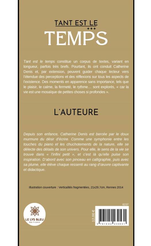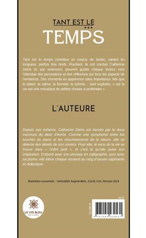 Tant est le temps constitue un corpus de textes, variant en longueur, parfois très brefs. Pourtant, ils ont conduit Catherine Denis et, par extension, peuvent guider chaque lecteur vers l'étendue des perceptions et des réflexions sur tous les aspects de l'existence. Des moments en apparence sans importance, tels que le plaisir, le calme, la fermeté, le rythme... sont explorés, « car la vie est une mosaïque de petites choses si profondes ».