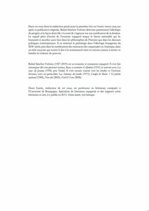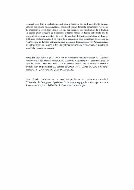 Cet essai, dont la traduction paraît en France trente-cinq ans après sa publication originale, traque la fausse rationalité qui lie humanité et sacrifice dans les discours politiques contemporains, dans les philosophies de l’histoire, dans les justifications des massacres des conquistadors en Amérique, avec un style essayiste qui ne renonce jamais à mettre en lumière la violence du pouvoir.