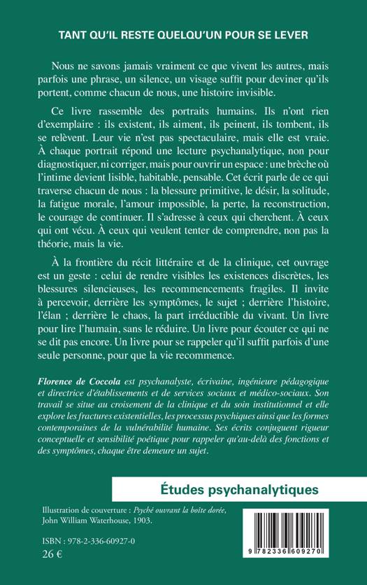Nous ne savons jamais vraiment ce que vivent les autres, mais parfois une phrase, un silence, un visage suffit pour deviner qu'ils portent, comme chacun de nous, une histoire invisible. Ce livre rassemble des portraits humains. Ils n'ont rien d'exemplaire: ils existent, ils aiment, ils peinent, ils tombent, ils se relèvent. Leur vie n'est pas spectaculaire, mais elle est vraie. À chaque portrait répond une lecture psychanalytique, non pour diagnostiquer, ni corriger, mais pour ouvrir un espace: une brèche où l'intime devient lisible, habitable, pensable. Cet écrit parle de ce qui traverse chacun de nous: la blessure primitive, le désir, la solitude, la fatigue morale, l'amour impossible, la perte, la reconstruction, le courage de continuer. Il s'adresse à ceux qui cherchent. À ceux qui ont vécu. À ceux qui veulent tenter de comprendre, non pas la théorie, mais la vie. À la frontière du récit littéraire et de la clinique, cet ouvrage est un geste: celui de rendre visibles les existences discrètes, les blessures silencieuses, les recommencements fragiles. Il invite à percevoir, derrière les symptômes, le sujet; derrière l'histoire, l'élan; derrière le chaos, la part irréductible du vivant. Un livre pour lire l'humain, sans le réduire. Un livre pour écouter ce qui ne se dit pas encore. Un livre pour se rappeler qu'il suffit parfois d'une seule personne, pour que la vie recommence.