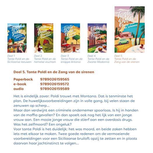Deel 5 in de serie over de eigenzinnige Tante Poldi die op Sicilië woont. Het is eindelijk zover: Poldi trouwt met Montana. Dat is tenminste het plan. De huwelijksvoorbereidingen zijn in volle gang, bij velen staan de zenuwen al op scherp. Maar - zoals je weet - Sicilië is ingewikkeld, er komt altijd wel iets tussen. Een criminele ondernemer verdwijnt spoorloos. Is hij in handen van de maffia gevallen? En dan spoelt ook nog het lijk van een jonge vrouw aan. De mooie jonge vrouw stierf aan een overdosis drugs. Was het zelfmoord? Een ongeluk? Voor tante Poldi is het duidelijk: het was moord, en beide zaken hebben iets met elkaar te maken. Twee goede redenen om de vermoeiende voorbereidingen voor een Siciliaanse bruiloft opzij te zetten en in plaats daarvan haar jachtinstinct te volgen…