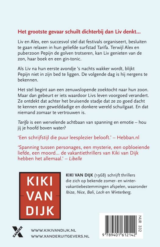 In de spannende thriller Tarifa besluiten Liv en Alex, een succesvol stel dat festivals organiseert, te gaan relaxen in hun geliefde surfstad Tarifa. Terwijl Alex en puberzoon Pepijn de golven trotseren, kan Liv genieten van de zon, haar boek en een gin-tonic.Als Liv na hun eerste avondje 's nachts wakker wordt, blijkt Pepijn niet in zijn bed te liggen. De volgende dag is hij nergens te bekennen.Het stel begint aan een zenuwslopende zoektocht naar hun zoon. Maar dan gebeurt er iets waardoor Livs leven voorgoed verandert. Ze ontdekt dat achter het bruisende stadje dat ze zo goed dacht te kennen een gewelddadige en donkere wereld schuilgaat. En dat niemand, zelfs de mensen die het dichtst bij haar staan, zomaar te vertrouwen is.Tarifa van Kiki van Dijk is een wervelende vakantiethriller die je meesleurt in een wereld van spanning en onverwachte wendingen in het surfwalhalla van Zuid-Spanje. Een verhaal vol emoties en gevaar, perfect voor een zomerse leeservaring.'Een schrijfstijl die puur leesplezier belooft.' - Hebban.nl'Spanning tussen personages, een mysterie, een opbloeiende liefde, een moord... de vakantiethrillers van Kiki van Dijk hebben het allemaal.' - Libelle'Zenuwslopende vakantiethrillers.' - Vriendin
