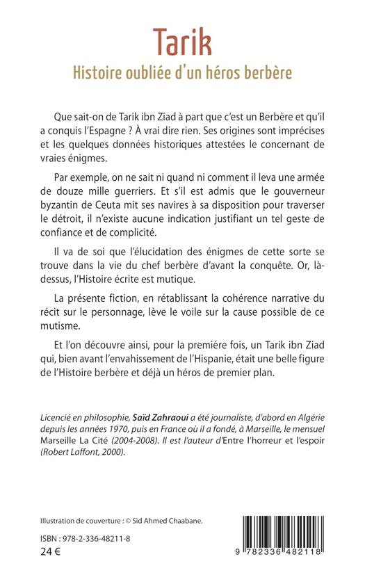 Que sait-on de Tarik ibn Ziad à part que c'est un Berbère et qu'il a conquis l'Espagne ? À vrai dire rien. Ses origines sont imprécises et les quelques données historiques attestées le concernant de vraies énigmes. Par exemple, on ne sait ni quand ni comment il leva une armée de douze mille guerriers. Et s'il est admis que le gouverneur byzantin de Ceuta mit ses navires à sa disposition pour traverser le détroit, il n'existe aucune indication justifiant un tel geste de confiance et de complicité. Il va de soi que l'élucidation des énigmes de cette sorte se trouve dans la vie du chef berbère d'avant la conquête. Or, là-dessus, l'Histoire écrite est mutique. La présente fiction, en rétablissant la cohérence narrative du récit sur le personnage, lève le voile sur la cause possible de ce mutisme. Et l'on découvre ainsi, pour la première fois, un Tarik ibn Ziad qui, bien avant l'envahissement de l'Hispanie, était une belle figure de l'Histoire berbère et déjà un héros de premier plan.