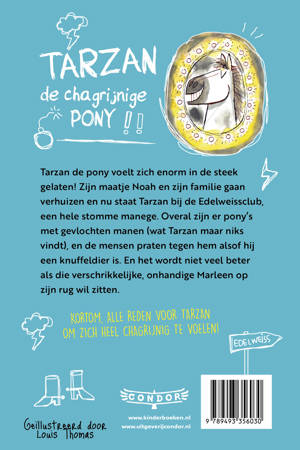 Tarzan de pony voelt zich enorm in de steek gelaten! Zijn maatje Noah en zijn familie gaan verhuizen en nu staat Tarzan bij een kostschool. Wat een vreselijke plek… Overal zijn er pony’s met gevlochten manen (wat Tarzan maar niks vindt), en de mensen praten tegen hem alsof hij een knuffeldier is. En het wordt niet veel beter als die verschrikkelijke, onhandige Marleen op zijn rug wil zitten. Kortom, alle reden voor Tarzan om zich heel chagrijnig te voelen!