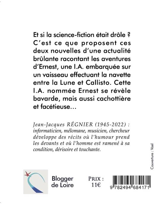 Et si la science-fiction était drôle ? C’est ce que proposent ces deux nouvelles d’une actualité brûlante racontant les aventures d’Ernest, une I.A. embarquée sur un vaisseau effectuant la navette entre la Lune et Callisto. Cette I.A. nommée Ernest se révèle bavarde, mais aussi cachottière et facétieuse…