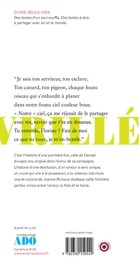 C'est l'histoire d'une première fois, celle de Danaël, dix-sept ans, englué dans l'ennui de sa campagne. L'histoire d'une désillusion, d'un amour à sens unique, un crush qui vire à la possession, à la violence. L'écriture vive et incisive de Joanne Richoux dissèque cette frontière parfois mince entre l'amour, la folie et la haine.