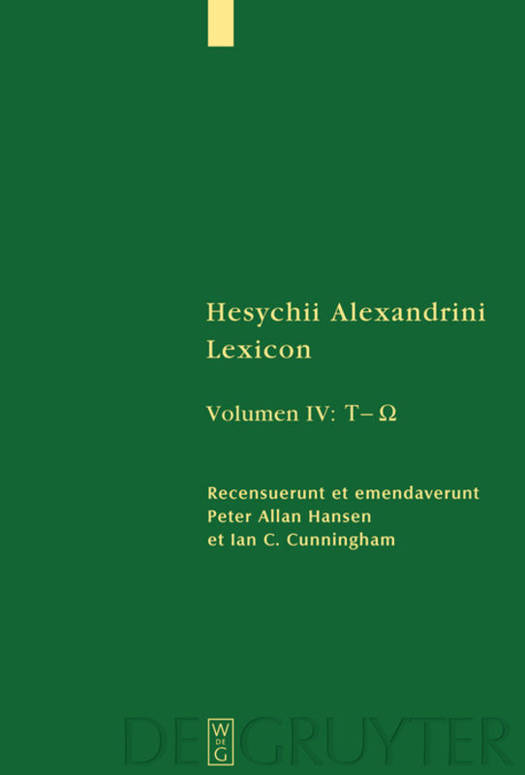 Hesychius' 5th(?)-century Greek lexicon is a very important survivor of ancient learning, including fragments of Greek literature and offering material, not yet fully evaluated, on patristic writings. The final critical edition was begun by Kurt Latte (Vol. 1, 1953 and Vol. 2, 1966, Copenhagen: Munksgaard; now out of print) and continued by Hansen (SGLG 11/3, 2005). As with vol. 3, the current vol. 4 provides for the first time a detailed report of the unique manuscript and a critical text, taking into account the relevant modern scholarship, and citing parallels from related works. A revised edition of the two Latte volumes followed (SGLG 11/1, 2017 and SGLG 11/2, 2019). A volume of indexes and addenda is planned (to be SGLG 11/5).