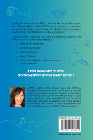 Quels sont les enjeux du TDA/H dans la vie des adultes qui en sont atteints ? D’où provient-il ? Comment peut-on en reconnaître les signes chez soi ou chez les autres ? Quelles répercussions ce trouble et ses manifestations ont-ils au quotidien ? Découvrez des stratégies qui vous permettront d’atténuer les effets du TDA/H. Elles vous aideront à : cesser de procrastiner, planifier et prioriser, rester concentré, éviter d’oublier, calmer votre agitation intérieure et gérer votre impulsivité. Ariane Hébert, déjà connue pour ses nombreux ouvrages portant sur le TDA/H ainsi que sur d’autres enjeux personnels et familiaux (l’anxiété, la parentalité, les émotions, etc.), revient cette fois avec un guide explicatif et pratique, ponctué de faits vécus et de conseils facilement applicables au quotidien. Une lecture agréable et stimulante, mais, surtout, un outil indispensable pour tous les adultes porteurs de TDA/H et leur entourage !