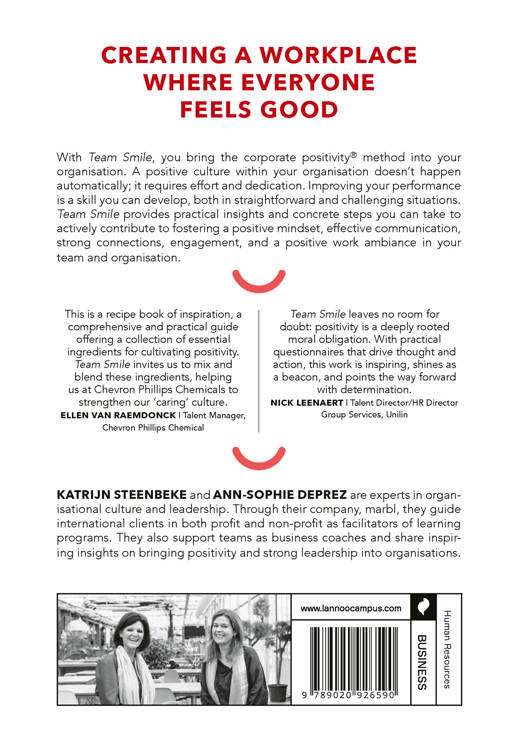 "This is a recipe book of inspiration, a comprehensive and practical guide offering a collection of essential ingredients for cultivating positivity. Team Smile invites us to mix and blend these ingredients, helping us at Chevron Phillips Chemicals to strengthen our 'caring' culture." - Ellen Van Raemdonck | Talent Manager, Chevron Phillips Chemical "Team Smile leaves no room for doubt: positivity is a deeply rooted moral obligation. With practical questionnaires that drive thought and action, this work is inspiring, shines as a beacon, and points the way forward with determination." - Nick Leenaert | Talent Director/HR Director Group Services, Unilin "Team Smile is a must for anyone concerned with the well-being of teams. Bringing together existing concepts from the perspective of positive psychology it offers an enriching and refreshing view on how people can function optimally. A must-read for anyone with a passion for people and organisational culture." - Ellen Neirynck | International Talent Director, SD Worx "Katrijn and Ann-Sophie provide 176 pages of inspiration to inject positivity into yourself and your organisation. You'll find plenty of concrete, achievable suggestions to build a sustainable workplace, a place where employees feel good." - Marc Croonen | Chief Human Resources, Sustainability and Communication, Vandemoortele