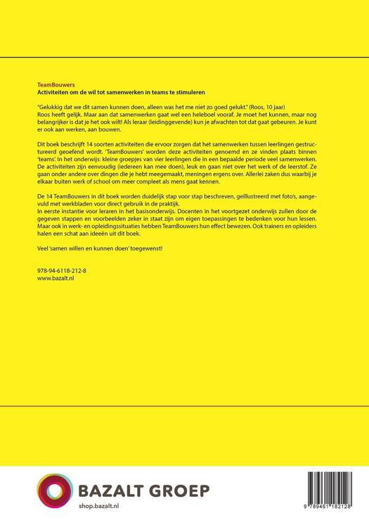 In dit boek vindt u de aanpak om het in teams willen en kunnen samenwerken krachtig te stimuleren. Het omvat stap-voor-stap aanwijzingen, tips, variaties, meer dan 100 teambuilding activiteiten en kopieerbladen voor de 14 TeamBouwers; de beste teambuilding werkvormen. Zoek De Valse, Team Interview, Gelijk-Ongelijk, om er een paar te noemen. Met deze activiteiten stimuleert u een positief klimaat in de teams en in de hele groep. Er ontstaat een harmonieuze samenwerking.
