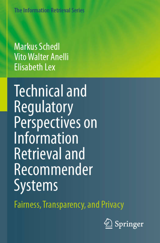This book provides an in-depth treatment of three important topical areas related to regulatory, ethical, and technical discussions in the context of information retrieval and recommender systems (IRRSs): (1) bias, fairness, and non-discrimination, (2) transparency and explainability, and (3) privacy and security. Sometimes referred to as trustworthiness dimensions, they are analyzed by taking an interdisciplinary perspective and incorporating views from computer science, social sciences, psychology, and law and by particularly considering the related technical challenges, societal impact, ethical considerations, and regulatory approaches.