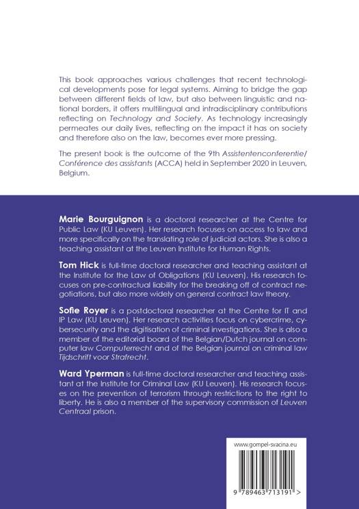 This book approaches various challenges that recent technological developments pose for legal systems. Aiming to bridge the gap between different fields of law, but also between linguistic and national borders, it offers multilingual and intradisciplinary contributions reflecting on Technology and Society. As technology increasingly permeates our daily lives, reflecting on the impact it has on society and therefore also on the law, becomes ever more pressing.