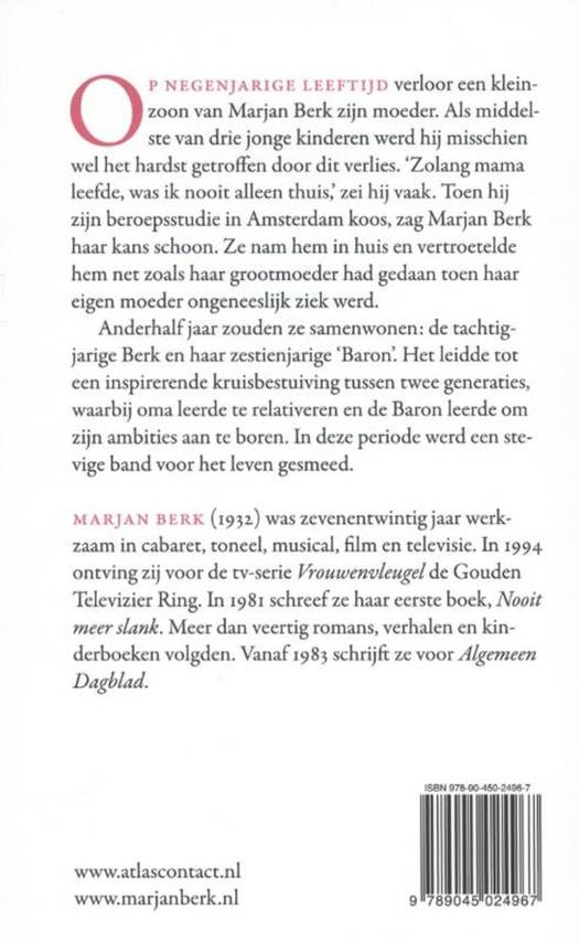 Op negenjarige leeftijd verloor een kleinzoon van Marjan Berk zijn moeder. Als middelste van drie jonge kinderen werd hij misschien wel het hardst getroffen door dit verlies. 'Zolang mama leefde, was ik nooit alleen thuis,' zei hij vaak. Toen hij zijn beroepsstudie in Amsterdam koos, zag Marjan Berk haar kans schoon. Ze nam hem in huis en vertroetelde hem net zoals haar grootmoeder had gedaan toen haar eigen moeder ongeneeslijk ziek werd. Anderhalf jaar zouden ze samenwonen: de tachtigjarige Berk en haar zestienjarige 'Baron'. Het leidde tot een inspirerende kruisbestuiving tussen twee generaties, waarbij oma leerde te relativeren en de Baron leerde om zijn ambities aan te boren. In deze periode werd een stevige band voor het leven gesmeed.