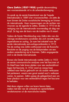 Binnen die Derde Internationale werkte Zetkin in 1923 de eerste communistische analyses over het fascisme uit. Ze bleef haar hele leven pleiten voor een eenheidsfront tegen het fascisme. In 1932 werd ze vanop haar ziekbed naar Berlijn gebracht om als oudste verkozene het parlement, waarin een groot aantal nazi’s verkozen waren, te openen. Zetkin greep de gelegenheid aan om haar pleidooi voor een eenheidsfront tegen het fascisme te herhalen.