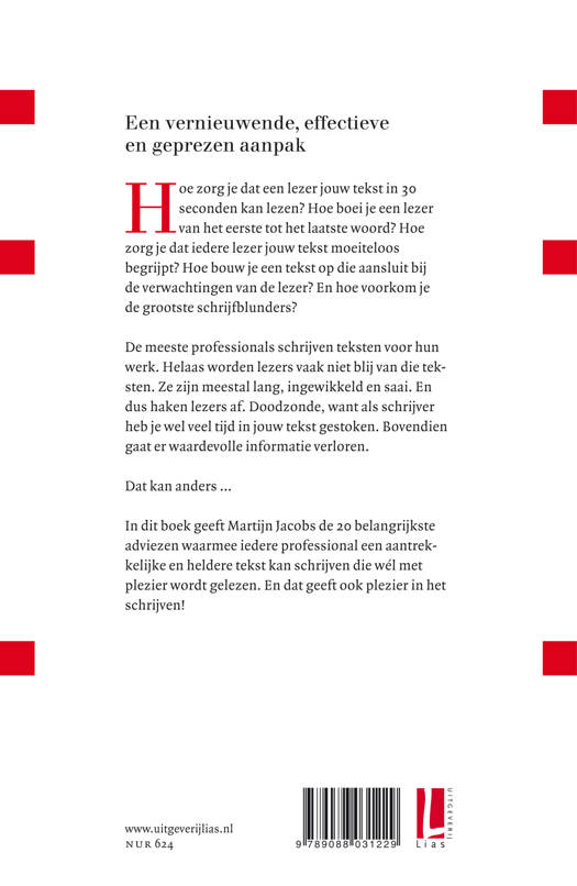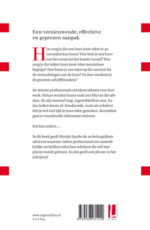 Hoe zorg je dat een lezer jouw tekst in 30 seconden kan lezen? Hoe boei je een lezer van het eerste tot het laatste woord? Hoe zorg je dat iedere lezer jouw tekst moeiteloos begrijpt? Hoe bouw je een tekst op die aansluit bij de verwachtingen van de lezer? En hoe voorkom je de grootste schrijfblunders?