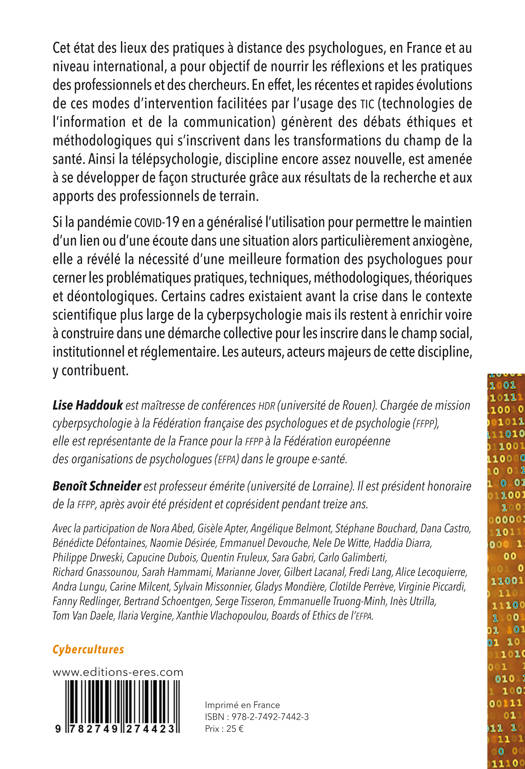 Cet état des lieux sur la télépsychologie en France et au niveau international a pour objectif de nourrir les réflexions et les pratiques des professionnels et des chercheurs. En effet, les récentes et rapides évolutions de ces modes d’intervention, facilitées par l’usage des tic (technologies de l’information et de la communication), s’accompagnent souvent d’un manque de connaissances préalables et de formation sur la télépsychologie. Cette discipline, encore assez nouvelle, est amenée à se développer de façon structurée grâce aux résultats de la recherche et aux apports des professionnels de terrain, pour fournir des outils complémentaires et mieux cadrés pour les psychologues. Si la pandémie Covid-19 a généralisé l’utilisation de la télépsychologie pour permettre le maintien d’un lien ou d’une écoute dans un contexte alors particulièrement anxiogène, elle a révélé la nécessité d’en cerner les problématiques pratiques, techniques, méthodologiques, théoriques et déontologiques. Certains cadres existaient avant la crise dans le contexte scientifique plus large de la cyberpsychologie mais ils restent à enrichir voire à construire dans une démarche collective pour les inscrire dans le champ social, institutionnel, et réglementaire.