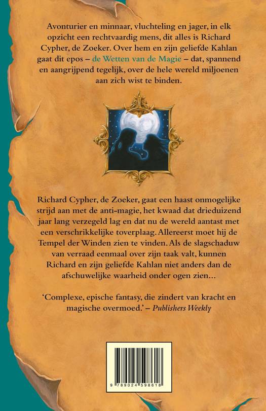(POD) Avonturier en minnaar, vluchteling en jager, in elk opzicht een rechtvaardig mens, dit alles is Richard Cypher, de Zoeker. Over hem en zijn geliefde Kahlan gaat dit epos - de Wetten van de Magie - dat, spannend en aangrijpend tegelijk, over de hele wereld miljoenen aan zich wist te binden.