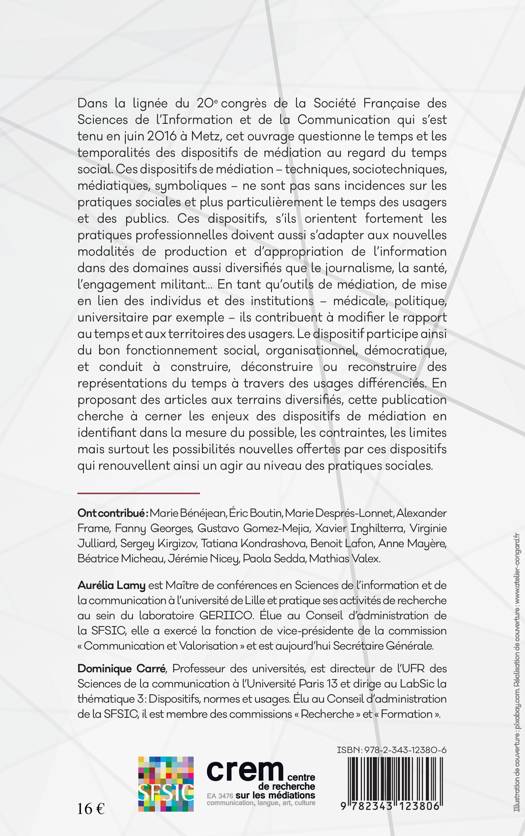 Cet ouvrage questionne le temps et les temporalités des dispositifs de médiation au regard du temps social. En proposant des articles aux terrains diversifiés, cette publication cherche à cerner les enjeux des dispositifs de médiation en identifiant dans la mesure du possible, les contraintes, les limites mais surtout les possibilités nouvelles offertes par ces dispositifs qui renouvellent ainsi un agir au niveau des pratiques sociales.