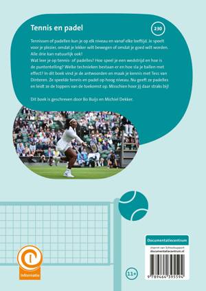 Tennis en padel Tennissen of padellen kun je op elk niveau en vanaf elke leeftijd. Je speelt voor je plezier, omdat je lekker wilt bewegen of omdat je goed wilt worden. Alle drie kan natuurlijk ook! Wat leer je op tennis- of padelles? Hoe speel je een wedstrijd en hoe is de puntentelling? Welke technieken bestaan er en hoe sla je ballen met effect? In dit boek vind je de antwoorden en maak je kennis met Tess van Dinteren. Ze speelde tennis en padel op hoog niveau. Nu geeft ze padelles en leidt ze de toppers van de toekomst op. Misschien hoor jij daar straks bij!