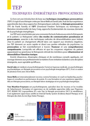 Ce livre est une introduction de base aux techniques énergétiques provocatrices (TEP). Il s'agit d'une thérapie créée par Steve Wells et David Lake, fruit de leur expérience approfondie dans deux approches thérapeutiques radicales : la thérapie provocatrice (TP) de Frank Farrelly et l'EFT (Emotional Freedom Techniques ou techniques de libération émotionnelle) de Gary Craig, approche fondamentale du nouveau domaine de la psychologie énergétique. Les TEP sont caractérisées par une connexion forte et chaleureuse entre le thérapeute et le patient. Le thérapeute utilise des modes de communication paradoxaux et provocateurs, associés à des techniques radicales de désensibilisation pour induire chez le patient un changement effectif dans son rapport aux émotions négatives. Les TEP donnent un accès rapide et direct aux parties refoulées du psychisme. La provocation se fait essentiellement à travers l'humour et une compréhension compatissante. Lorsqu'elle est efficace et que les croyances négatives du patient apparaissent au grand jour, le thérapeute stimule les méridiens pour réharmoniser et désensibiliser l'émotion toxique. Enrichi d'exercices, d'exemples cliniques et de nombreux conseils appliqués, cet ouvrage donnera aux professionnels la matière d'une initiation éclairée à une discipline émergente, aussi agréable qu'efficace.
