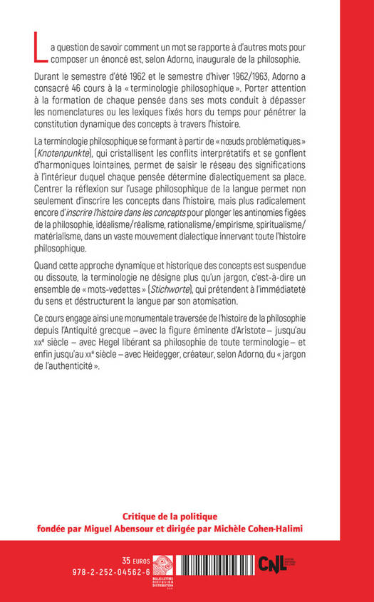La question de savoir comment un mot se rapporte a d'autres mots pour composer un enonce est, selon Adorno, inaugurale de la philosophie. Durant le semestre d'ete 1962 et le semestre d'hiver 1962/1963, Adorno a consacre 46 cours a la terminologie philosophique . Porter attention a la formation de chaque pensee dans ses mots conduit a depasser les nomenclatures ou les lexiques fixes hors du temps pour penetrer la constitution dynamique des concepts a travers l'histoire. La terminologie philosophique se formant a partir de noeuds problematiques (Knotenpunkte), qui cristallisent les conflits interpretatifs et se gonflent d'harmoniques lointaines, permet de saisir le reseau des significations a l'interieur duquel chaque pensee determine dialectiquement sa place. Centrer la reflexion sur l'usage philosophique de la langue permet non seulement d'inscrire les concepts dans l'histoire, mais plus radicalement encore d'inscrire l'histoire dans les concepts pour plonger les antinomies figees de la philosophie, idealisme/realisme, rationalisme/empirisme, spiritualisme/materialisme, dans un vaste mouvement dialectique innervant toute l'histoire philosophique. Quand cette approche dynamique et historique des concepts est suspendue ou dissoute, la terminologie ne designe plus qu'un jargon, c'est-a-dire un ensemble de mots-vedettes (Stichworte), qui pretendent a l'immediatete du sens et destructurent la langue par son atomisation. Ce cours engage ainsi une monumentale traversee de l'histoire de la philosophie depuis l'Antiquite grecque - avec la figure eminente d'Aristote - jusqu'au XIXe siecle - avec Hegel liberant sa philosophie de toute terminologie - et enfin jusqu'au XXe siecle - avec Heidegger, createur, selon Adorno, du jargon de l'authenticite .