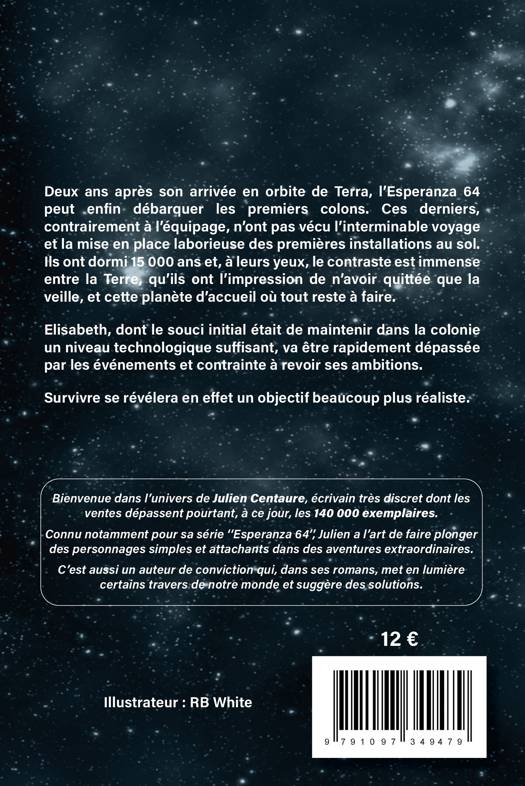 Deux ans après son arrivée en orbite de Terra, l'Esperanza 64 peut enfin débarquer les premiers colons. Ces derniers, contrairement à l'équipage, n'ont pas vécu l'interminable voyage et la mise en place laborieuse des premières installations au sol. Ils ont dormi 15 000 ans et, à leurs yeux, le contraste est immense entre la Terre, qu'ils ont l'impression de n'avoir quittée que la veille, et cette planète d'accueil où tout reste à faire.