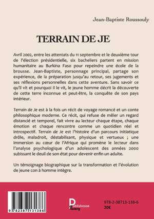 Terrain de je est a la fois un recit de voyage romance et un conte philosophique moderne. Ce recit, qui refuse de meler un regard distancie et temporel, fait vivre au lecteur chaque etape, chaque emotion et chaque rencontre comme un quotidien reel et introspectif. Terrain de je est lhistoire dun parcours initiatique drole, maladroit, destabilisant, physique et vertueux ; une immersion au cur de lAfrique qui promene le lecteur dans lanalyse psychologique dun ado des annees 2000 subissant le deuil de son etat pour devenir enfin un adulte. Un temoignage biographique sur la transformation et levolution de jeune con a homme integre.