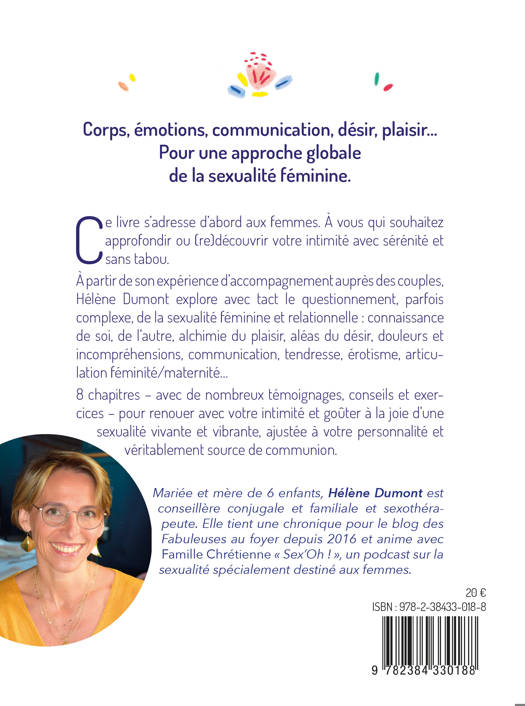 A partir de son expérience d’accompagnement auprès des couples, Hélène Dumont explore avec tact et sans fausse pudeur le questionnement, parfois complexe, de la sexualité féminine : connaissance de soi, de l’autre, alchimie du plaisir, aléas du désir, douleurs et incompréhensions, communication, tendresse, érotisme, articulation féminité/maternité… 8 chapitres – avec de nombreux témoignages, conseils et exercices – pour les femmes qui veulent renouer avec leur intimité et goûter à la joie d’une sexualité vivante et vibrante, ajustée à leur personnalité et véritablement source de communion.