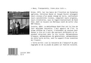 « Nous, Transparents, irons plus loin »… Dijon, 1971. Sur les bancs de l’institut de formation agricole, Christian Malon et Joseph Pacini échangent leurs visions d’un monde chargé de terre, confrontent leurs sensibilités rurales, comparent leurs origines, leurs itinéraires… sous le regard bienveillant de René Char, dont le recueil les Matinaux vient de sortir chez NRF‐Poésie. Issoire, 2014. La médiathèque René Char est le lieu de leur deuxième rencontre. L’oeil aguerri de l’un, la plume affûtée de l’autre, s’entendent de nouveau pour donner à lire et à voir des parcours différents et cependant enracinés dans la vie rurale. Métamorphoses d’espace, métamorphoses de générations, métamorphoses de cette terre écrite, sont le support d’une invention de l’avenir. « Terre écrite » est la rencontre de l’objectif du photographe et de la plume du poète sur fond de ruralité.