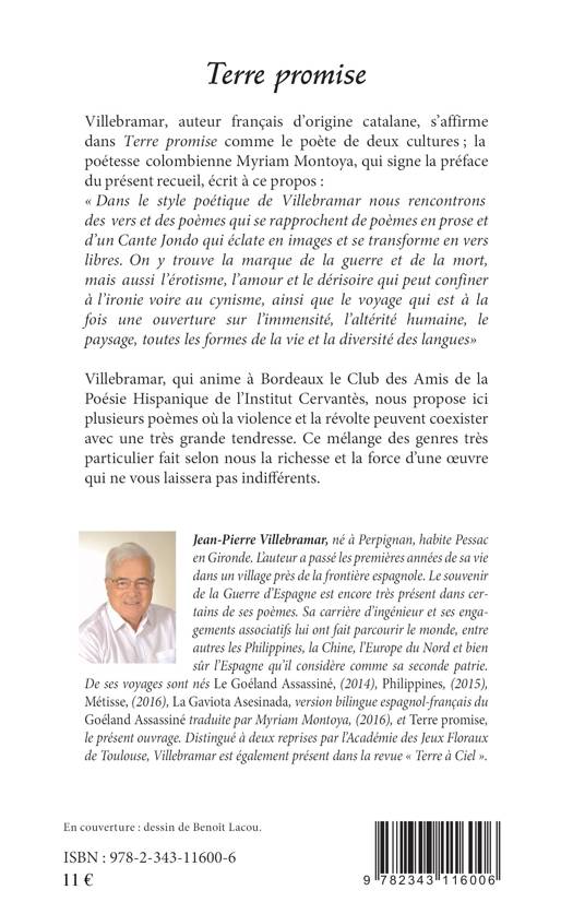 Villebramar, auteur français d'origine catalane, s'affirme dans Terre promise comme le poète de deux cultures ; la poétesse colombienne Myriam Montoya, qui signa la préface du présent recueil, écrit à ce propos : « Dans le style poétique de Villebramar nous rencontrons des vers et des poèmes qui se rapprochent de poèmes en prose d'un Cante Jondo qui éclate en images et se transforme en vers libres. On y trouve la marque de la guerre et de la mort, mais aussi l'érotisme, l'amour et le dérisoire qui peut confiner à l'ironie voire au cynisme, ainsi que le voyage qui est à la fois une ouverture sur l'immensité, l'altérité humaine, le paysage, toutes les formes de la vie et de la diversité des langues ». Villebramar qui anime à Bordeaux le Club des Amis de la Poésie Hispanique de l'Institut Cervantès, nous propose ici plusieurs poèmes om la violence et la révolte peuvent coexister avec une très grande tendresse. Ce mélange des genres très particulier fait selon nous la richesse et la force d'une oeuvre qui ne nous laissera pas indifférents.