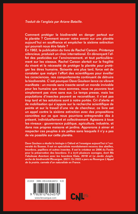 Comment protéger la biodiversité en danger partout sur la planète ? Comment sauver notre avenir sur une planète aujourd'hui en souffrance et empêcher la sixième extinction qui pourrait nous être fatale ? En 1962, la publication du livre de Rachel Carson, Printemps silencieux, produisit un choc international. En dénonçant l'effet des pesticides sur l'environnement, et tout particulièrement sur les oiseaux, Rachel Carson alertait sur la fragilité du vivant et la nécessité de protéger la planète pour protéger les êtres humains. Soixante ans plus tard, force est de constater que malgré l'effort des scientifiques pour éveiller les consciences, nos comportements continuent de détruire la biodiversité. C'est pourquoi Dave Goulson lance ce vibrant manifeste : un monde sans insecte serait un monde invivable pour les humains que nous sommes, nous ne pouvons tout simplement pas vivre sans eux. Le temps presse, mais les populations d'insectes peuvent se reconstituer, il n'est pas trop tard et les solutions sont à notre portée. Cri d'alerte et de mobilisation qui s'appuie sur la recherche scientifique de pointe et sur le travail d'une vie de chercheur, ce livre est un appel contre la sixième extinction avec des propositions concrètes sur ce que nous pourrions entreprendre dès à présent, individuellement et collectivement. Agissons à tous les niveaux : gouvernance publique, agriculture, industrie, et dans nos propres maisons et jardins. Apprenons à aimer et respecter ces peuples à six pattes sans lesquels il n'y a pas de vie possible sur cette planète.