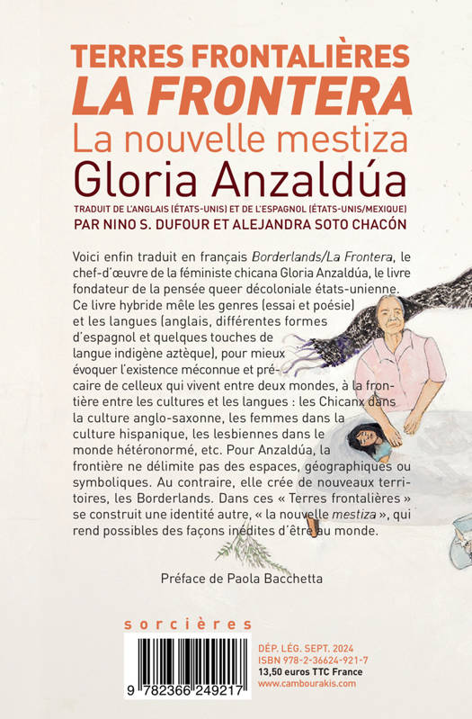 Voici enfin traduit en français Borderlands/La Frontera, le chef-d'oeuvre de la féministe chicana Gloria Anzaldúa, le livre fondateur de la pensée queer décoloniale états-unienne. Ce livre hybride mêle les genres (essai et poésie) et les langues (anglais, différentes formes d'espagnol et quelques touches de langue indigène aztèque), pour mieux évoquer l'existence méconnue et précaire de celleux qui vivent entre deux mondes, à la frontière entre les cultures et les langues : les Chicanx dans la culture anglo- saxonne, les femmes dans la culture hispanique, les lesbiennes dans le monde hétéronormé, etc. Pour Anzaldúa, la frontière ne délimite pas des espaces, géographiques ou symboliques. Au contraire, elle crée de nouveaux territoires, les Borderlands. Dans ces « Terres frontalières » se construit une identité autre, « la nouvelle mestiza », qui rend possibles des façons inédites d'être au monde.