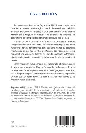 Terres oubliées, l'oeuvre de Seyfettin Araç, dresse les portraits humains d'une époque (de 1986 à 2018), d'un territoire; celui du Sud-est anatolien en Turquie; et plus précisément de la ville de Mardin qui a toujours symbolisé une diversité de langues, de convictions et de types d'appartenance depuis des siècles. Il s'agit du récit de quatre enfants issus de quatre familles villageoises qui se réunissent à l'internat de Mazıdağı, établi à une hauteur de 1030 à 1090 mètres dans la plaine nichée au coeur des montagnes en cercle, à 47 km de Mardin. Ces récits entrelacés exposent une variété de thèmes tels que l'assassinat, la trahison, l'isolement, l'amitié, le mutisme amoureux, le viol, le suicide et la mort. Cette narration polyphonique qui entremêle plusieurs récits à la première personne illustre l'image de l'enfance souffrante de quatre enfants, orphelins de père (trois garçons et une fille, issus de quatre foyers), venus des contrées délaissées, dépouillés de tout sauf de leurs rêves, tentant d'assurer leur survie et de maintenir leur existence.
