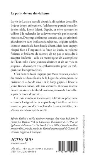 La vie de Lucia a basculé depuis la disparition de sa fille. Le jour de son enlèvement, l'adolescente portait le maillot de son idole, Lionel Messi. Depuis, sa mère parcourt les collines à la recherche des cadavres ensevelis par les cartels mexicains. Des corps de femmes souvent, que des criminels abandonnent dans les fosses clandestines, les puits oubliés, les trous creusés à la hâte dans le désert. Mais dans un pays résigné face à l'impunité, la force de Lucia, sa volonté furieuse et brûlante de résister, de ne pas se résoudre à accepter l'infamie - celle du mensonge et de la complicité de l'État, celle d'une jeunesse décimée et de ces vies en suspens - deviennent vite embarrassantes pour les trafiquants et leurs protecteurs. C'est dans ce décor tragique que Messi entre en jeu, lors du match de demi-finales de la Ligue des champions. Le ravisseur en a décidé ainsi : si le Barça gagne, il libère la jeune Bianca. Sinon, elle sera exécutée. Paradoxe insensé faisant coexister la futilité d'un championnat de football et le prix dérisoire d'une vie... Un texte sombre et incantatoire, à l'écriture pénétrante - comme les tiges de fer et les pioches qui fouillent ces terres voraces -, pour sonder l'ampleur des fissures invisibles, des séismes silencieux qu'elle révèle.
