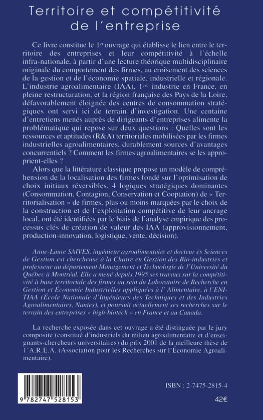 Ce livre constitue le 1er ouvrage qui établisse le lien entre le territoire des entreprises et leur compétitivité à l’échelle infra-nationale, à partir d’une lecture théorique multidisciplinaire originale du comportement des firmes, au croisement des sciences de la gestion et de l’économie spatiale, industrielle et régionale. L’industrie agroalimentaire (IAA), 1ère industrie en France, en pleine restructuration, et la région des Pays de la Loire, défavorablement éloignée des centres de consommation stratégiques ont servi ici de terrain d’investigation.