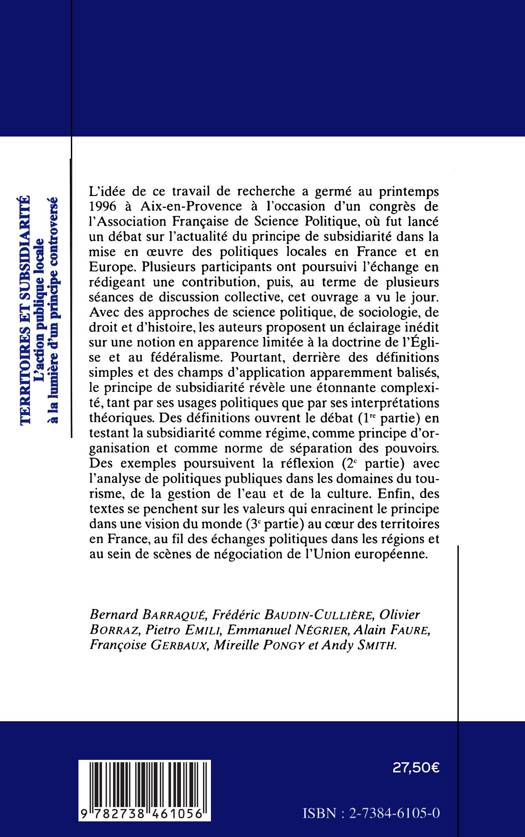 L'idée de ce travail de recherche a germé au printemps 1996 à Aix-en-Provence à l'occasion d'un congrès de l'Association Française de Science Politique, où fut lancé un débat sur l'actualité du principe de subsidiarité dans la mise en œuvre des politiques locales en France et en Europe. Plusieurs participants ont poursuivi l'échange en rédigeant une contribution, puis, au terme de plusieurs séances de discussion collective, cet ouvrage a vu le jour. Avec des approches de science politique, de sociologie, de droit et d'histoire, les auteurs proposent un éclairage inédit sur une notion en apparence limitée à la doctrine de l'Église et au fédéralisme. Pourtant, derrière des définitions simples et des champs d'application apparemment balisés, le principe de subsidiarité révèle une étonnante complexité, tant par ses usages politiques que par ses interprétations théoriques. Des définitions ouvrent le débat (1re partie) en testant la subsidiarité comme régime, comme principe d'organisation et comme norme de séparation des pouvoirs. Des exemples poursuivent la réflexion (2' partie) avec l'analyse de politiques publiques dans les domaines du tourisme, de la gestion de l'eau et de la culture. Enfin, des textes se penchent sur les valeurs qui enracinent le principe dans une vision du monde (3' partie) au cœur des territoires en France, au fil des échanges politiques dans les régions et au sein de scènes de négociation de l'Union européenne.