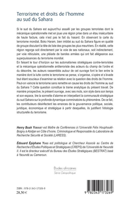 En faisant le tour d'horizon sur les automatismes stratégiques contre-terroristes et la mécanique opérationnelle antiterroriste des acteurs du champ de l'ordre et du désordre, les auteurs de cet ouvrage font le lien entre la manière dont la lutte contre le terrorisme se pense, s'organise, s'opère et s'évade tout étant soucieux d'examiner sa relation avec la question des droits de l'homme. Peut-on vaincre le terrorisme sans remettre en cause les droits de l'homme au sud du Sahara ?