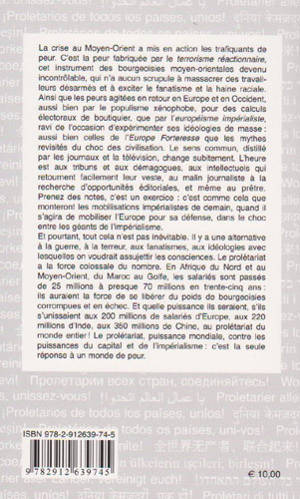 La crise au Moyen-Orient a mis en action les trafiquants de peur. C'est la peur fabriquée par le terrorisme réactionnaire, cet instrument des bourgeoisies moyen-orientales devenu incontrôlable, qui n'a aucun scrupule à massacrer des travailleurs désarmés et à exciter le fanatisme et la haine raciale. Ainsi que les peurs agitées en retour en Europe et en Occident, aussi bien par le populisme xénophone, pour des calculs électoraux de boutiquiers, que par l'européisme impérialiste, ravi de l'occasion d'expérimenter ses idéologies de masse: aussi bien celles de l'Europe Forteresse que les mythes revisités du choc des civilisations. Le sens commun, distillé par les journaux et les télévisions, change subitement. L'heure est aux tribuns et aux démagogues, aux intellectuels qui retournent facilement leur veste, au malin journaliste à la recherche d'opportunités éditoriales, et même au prêtre. Prenez des notes, c'est un exercise: c'est comme cela qie monteront les mobilisations impérialistes de demain, quand il s'agira de mobiliser l'Europe pour sa défense, dans le choc entre les géants de l'impérialisme. Et pourtant, tout cela n'est pas inévitable. Il y a une alternative à la guerre, à la terreur, aux fanatismes, aux idéologies avec lesquelles on voudrait assujettir les consciences. Le prolétariat a la force colossale du nombre. En Afrique du Nord et au Moyen-Orient, du Maroc au Golfe, les salariés sont passés de 25 millions à presque 70 millions en trente-cinq ans: ils auraient la force de se libérer du poids de bourgeoisies corrompues et en échec. Et quelle puissance ils seraient, s'ils s'unissaient aux 200 millions de salariés d'Europe, aux 220 millions d'Inde, aux 350 millions de Chine, au prolétariat du monde entier! Le prolétariat, puissance mondiale, contre les puissances du capital et de l'impérialisme: c'est la seule réonse à un monde de peur.