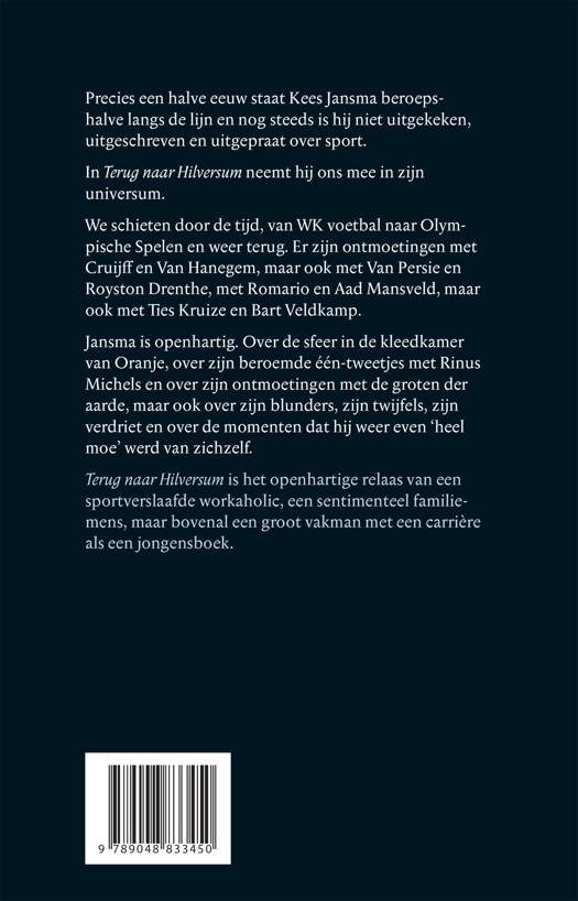 Terug naar Hilversum is het openhartige relaas van een sportverslaafde workaholic, een sentimenteel familiemens, maar bovenal een groot vakman met een carrière als een jongensboek.