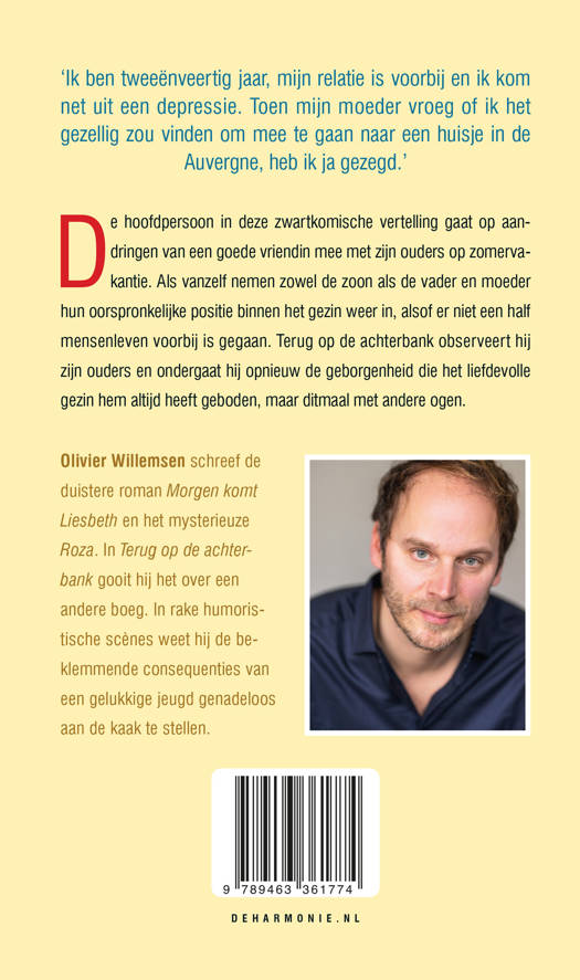 De hoofdpersoon in deze zwartkomische vertelling gaat op aandringen van een goede vriendin mee met zijn ouders op zomervakantie. Als vanzelf nemen zowel de zoon als de vader en moeder hun oorspronkelijke positie binnen het gezin weer in, alsof er niet een half mensenleven voorbij is gegaan. In Terug op de achterbank observeert hij zijn ouders en ondergaat hij opnieuw de geborgenheid die het liefdevolle gezin hem altijd heeft geboden, maar ditmaal met andere ogen. Olivier Willemsen schreef het duistere Morgen komt Liesbeth en het mysterieuze Roza. In Terug op de achterbank gooit hij het over een andere boeg. In humoristische scènes weet hij in deze roman de beklemmende consequenties van een gelukkige jeugd genadeloos aan de kaak te stellen.