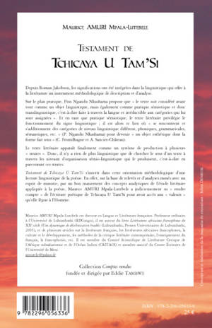 Testament de Tchicaya U Tam'Si s'inscrit dans l'orientation méthodologique d'une lecture linguistique de la poésie. En effet, sur la base de relevés et d'analyses menés avec un esprit de minutie, par un bon maniement des concepts analytiques de l'étude littéraire appliquée à la poésie, Maurie AMURI Mpala-Lutebele a judicieusement su "rendre compte" de l'écriture poétique de Tchicaya U Tam'Si pour avoir accès aux "valeurs" qu'elle lègue à l'Homme