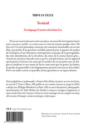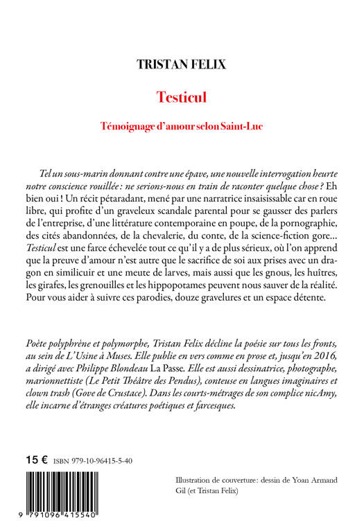Tel un sous-marin donnant contre une épave, une nouvelle interrogation heurte notre conscience rouilléeâ: ne serions-nous en train de raconter quelque choseâ? Eh bien ouiâ! Un récit pétaradant, mené par une narratrice insaisissable car en roue libre, qui profite d’un graveleux scandale parental pour se gausser des parlers de l’entreprise, d’une littérature contemporaine en poupe, de la pornographie, des cités abandonnées, de la chevalerie, du conte, de la science-fiction gore... Testicul est une farce échevelée tout ce qu’il y a de plus sérieux, où l’on apprend que la preuve d’amour n’est autre que le sacrifice de soi aux prises avec un dragon en similicuir et une meute de larves, mais aussi que les gnous, les huîtres, les girafes, les grenouilles et les hippopotames peuvent nous sauver de la réalité. Pour vous aider à suivre ces parodies, douze gravelures et un espace détente.