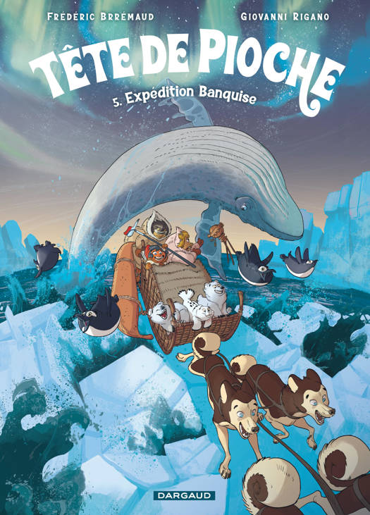 Heureusement que Milady est là pour élargir l'horizon de sa petite soeur Tête de Pioche ! Alors, certes, la forêt est très belle, Mamie est la reine des gâteaux, les marmottes sont bien contentes de déguster leur petit déjeuner de bienvenue après l'hibernation, et le renard bien soulagé d'être libéré de son piège... mais qui a permis à Tête de Pioche de découvrir le bayou et le Yucatán ? C'est Milady, bien sûr ! Et son arrivée chez Mamie fait une fois encore sensation : aujourd'hui pilote d'avion, elle est en tête du vol en V des oies sauvages. Après s'être essayée aux claquettes et à l'archéologie, elle se lance dans la réalisation d'un documentaire sur la banquise, dans le Grand Nord. Et il faudra bien que quelqu'un communique avec les animaux du coin pour aider Milady à différencier les pingouins des manchots... Voilà donc les deux soeurs prêtes à décoller : de là-haut, vue imprenable sur les bisons et les chutes du Niagara avant de rejoindre la station de chiens de traîneau. Tandis que Milady admire, fascinée, un bateau pris dans la glace, Tête de Pioche croise orques, ours polaires, baleines et renard blanc... Mais il ne faut pas rêver : même dans le Grand Nord, il y a toujours des humains malintentionnés, et nos deux héroïnes vont avoir fort à faire avec les baleiniers... Chaque album nous enchante et nous emmène vers de nouvelles contrées à la suite de la malicieuse Tête de Pioche. Pour ce cinquième tome, Brrémaud offre au dessinateur Giovanni Rigano les étendues glacées du Grand Nord. Et le talent de celui-ci pour croquer les animaux ? également vu depuis dans Weekly, le spin-off de Blacksad ? fait encore des merveilles !