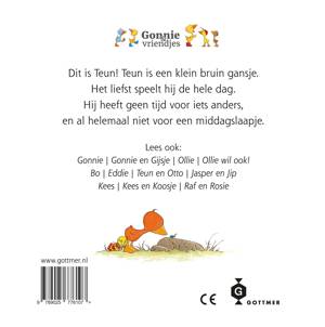 Dit is Teun! Teun is een klein, bruin gansje, en hij speelt de hoofdrol in dit kartonboekje voor peuters uit de 'Gonnie en vriendjes'-serie. Het liefst speelt hij de hele dag. Hij heeft geen tijd voor iets anders, en al helemaal niet voor een middagslaapje. Hij rent en stuitert en speelt de hele dag, en hij is nóóit moe. Hoor. Herkenbaar?