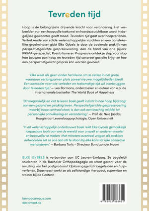 Tevreden tijd gaat over hoopverlenen. Vertrekkende van solide wetenschappelijke inzichten en een aanstekelijke groeimindset gidst Elke Gybels je door de boeiende praktijk van perspectiefgerichte gespreksvoering.