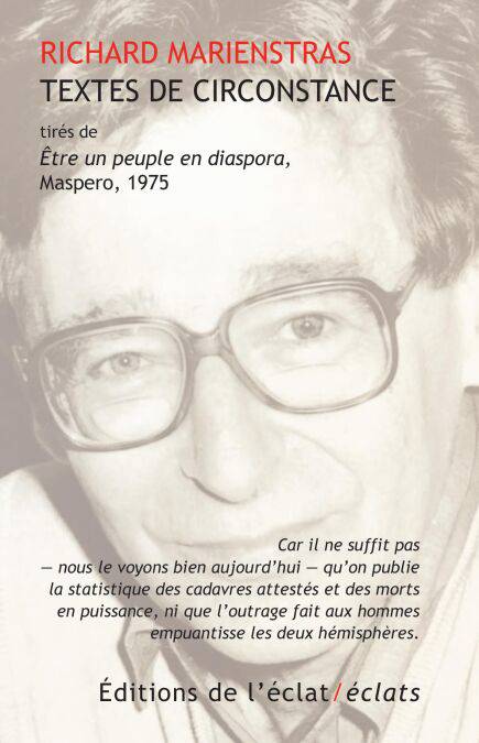 La génération qui a lu Être un peuple en diaspora, (Maspero 1975), a été marquée par cette lecture, qui offrait à une certaine jeunesse de la gauche européenne une alternative rêvée à l’articulation du sionisme et de l’être juif. Avec Marienstras, elle disposait d’une ‘bible’ qui valorisait l’‘être en diaspora’ d’un peuple millénaire. Dans la réédition de 2014, deux textes n’ont pas été retenus par le nouvel éditeur La lecture de ces « Textes de circonstance » nous a semblé au contraire d’une extraordinaire actualité. Par leurs titres mêmes ils apportent un éclairage sur les enjeux de cette situation : « Israël n’est pas négociable » (au sortir de la Guerre des Six jours) et « Un génocide dans le sens de l’histoire » sur l’usage du terme génocide dans la guerre du Biafra (1968).