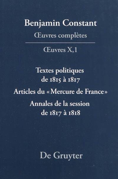 Ce tome X des uvres complètes de Benjamin Constant contient tous les textes politiques et journalistiques de cet auteur écrits entre juillet 1815 et avril 1818, à l'exception toutefois des textes contenus dans le Cours de politique constitutionnelle dont le premier volume paraît vers la fin de 1817, et des textes sur le procès de Wilfrid Regnault, la grande affaire juridique qui a profondément marqué la France dès le début de l'année 1818. On les trouvera dans le tome suivant. Le tome X est divisée en six sections, à savoir: La première section, intitulée "Mémoires, brochures et articles de journaux rédigés entre juillet et octobre 1815" s'ouvre avec les deux versions du fameux Mémoire apologétique où Constant justifie sa conduite pendant les Cent-Jours. Elle contient en outre un des plus beaux textes de sa plume, un mémoire destiné à être soumis à Louis XVIII pour intervenir en faveur de son ami Charles de Labédoyère, condamné à mort pour s'être rallié à Napoléon pendant les Cent-Jours. La seconde section réunit les textes écrits pendant l'exil volontaire à Londres, dont une étude, en anglais, sur Joseph Fouché. La troisième section est réservée aux trois versions de la polémique contre l'ouvrage-clef de Chateaubriand, De la Monarchie selon la Charte. Les articles publiés dans le Mercure de France en 1817 forment la quatrième section. La cinquième offre les nombreux articles et brochures publiés en 1817, dont un ouvrage remarquable sur la législation de la presse en France et des publications autour des élections de 1817. La dernière section ne contient que les Annales de la session de 1817 à 1818, une analyse lucide du travail des députés de cette session parlementaire. Le volume est complété par des annexes (procès du maréchal Ney; un compte rendu de l'ouvrage de Hobhouse sur les Cent-Jours; des textes polémiques dirigés contre Constant), une chronologie détaillée, des instruments bibliographiques et des index. Les éditeurs se sont proposés de donner des textes critiques fiables, de les munir d'introduction qui en expliquent les circonstances essentielles et les impacts idéologiques pour les replacer dans le contexte historique reconstitué avec soin.