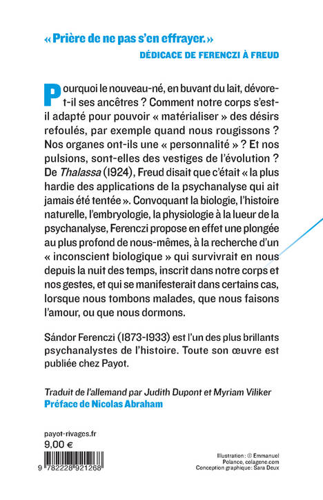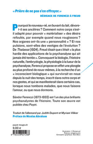 Pourquoi le nouveau-né, en buvant du lait, dévore-t-il ses ancêtres ? Comment notre corps s'est-il adapté pour pouvoir « matérialiser » des désirs refoulés, par exemple quand nous rougissons ? Nos organes ont-ils une « personnalité » ? Et nos pulsions, sont-elles des vestiges de l'évolution ? De «Thalassa» (1924), Freud disait que c'était « la plus hardie des applications de la psychanalyse qui ait jamais été tentée ». Convoquant la biologie, l'histoire naturelle, l'embryologie, la physiologie à la lueur de la psychanalyse, Ferenczi propose en effet une plongée au plus profond de nous-mêmes, à la recherche d'un « inconscient biologique » qui survivrait en nous depuis la nuit des temps, inscrit dans notre corps et nos gestes, et qui se manifesterait dans certains cas, lorsque nous tombons malades, que nous faisons l'amour, ou que nous dormons.