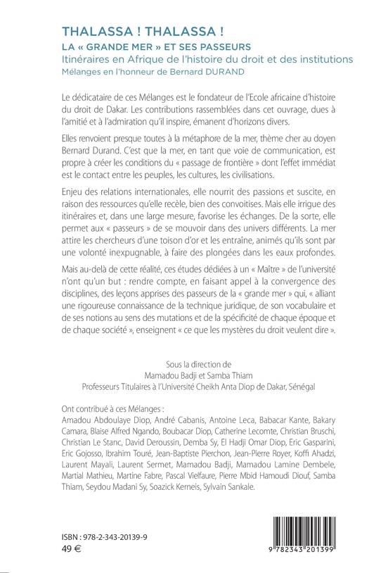 Le dédicataire de ces Mélanges est le fondateur de l'Ecole africaine d'histoire du droit de Dakar. Les contributions renvoient presque toutes à la métaphore de la mer, thème cher au doyen Bernard Durand. C'est que la mer, en tant que voie de communication, est propre à créer les conditions du « passage de frontière » dont l'effet immédiat est le contact entre les peuples, les cultures, les civilisations. Enjeu des relations internationales, elle nourrit des passions et suscite, en raison des ressources qu'elle recèle, bien des convoitises. Mais elle irrigue des itinéraires et, dans une large mesure, favorise les échanges. De la sorte, elle permet aux « passeurs » de se mouvoir dans des univers différents.