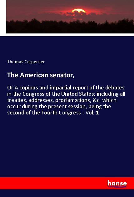 The American senator, - Or A copious and impartial report of the debates in the Congress of the United States: including all treaties, addresses, proclamations, &c. which occur during the present session, being the second of the Fourth Congress - Vol. 1 is an unchanged, high-quality reprint of the original edition of 1796. Hansebooks is editor of the literature on different topic areas such as research and science, travel and expeditions, cooking and nutrition, medicine, and other genres. As a publisher we focus on the preservation of historical literature. Many works of historical writers and scientists are available today as antiques only. Hansebooks newly publishes these books and contributes to the preservation of literature which has become rare and historical knowledge for the future.
